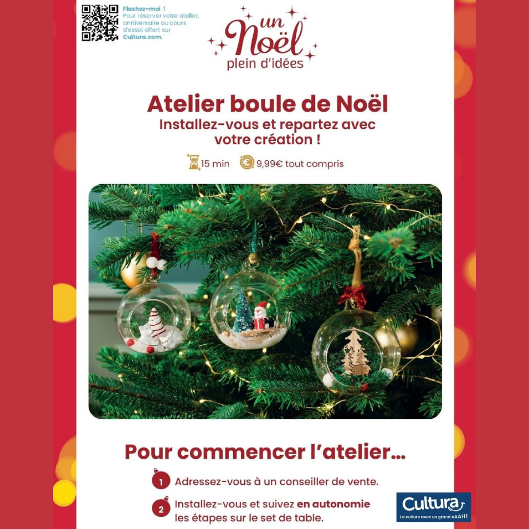 24 novembre 2025 Atelier de Noël chez Cultura Cultura propose de nombreux ateliers express de Noël qui sont tous au prix de 9€99 ! N’hésitez pas à vous inscrire pour passer un moment convivial et suite à cet atelier, repartir avec votre création unique ! Partagez ceci : Aller sur Facebook Contact